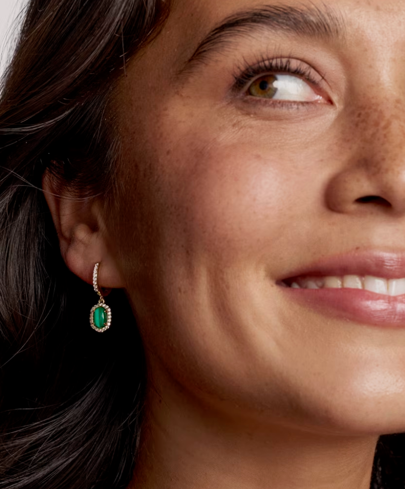 Metal 14k Yellow Gold Over Brass Material Green Malachite, White CZ Closure Ear Post Size 0.57" Outside Diameter, 0.48"L X 0.32"W Charm   Due to the one-of-a-kind nature of the medium, exact colors and patterns...