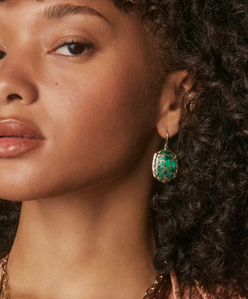 Details Metal 14k Yellow Gold Over Brass Material Bronze Veined Green Malachite Closure Earwire Size 1.62"L X 0.81"W   Due to the one-of-a-kind nature of the medium, exact colors and patterns may vary slightly from...