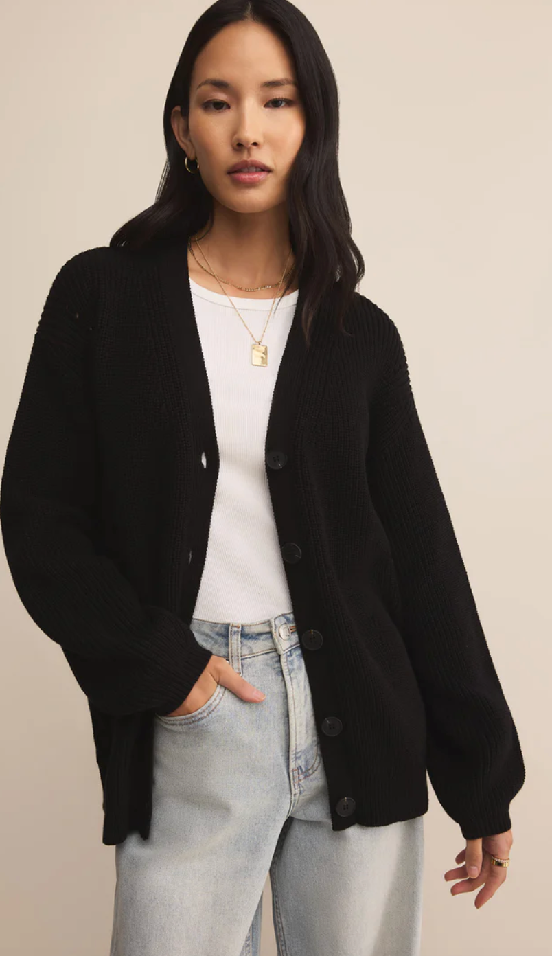 Knit from soft, textured cotton yarns in a relaxed rib stitch, this button-up sweater has a lived-in feel with thoughtful details. Featuring a deep v-neckline, subtle pointelle accents, and a slouchy silhouette, it’s made for layering on breezy days and cool nights.