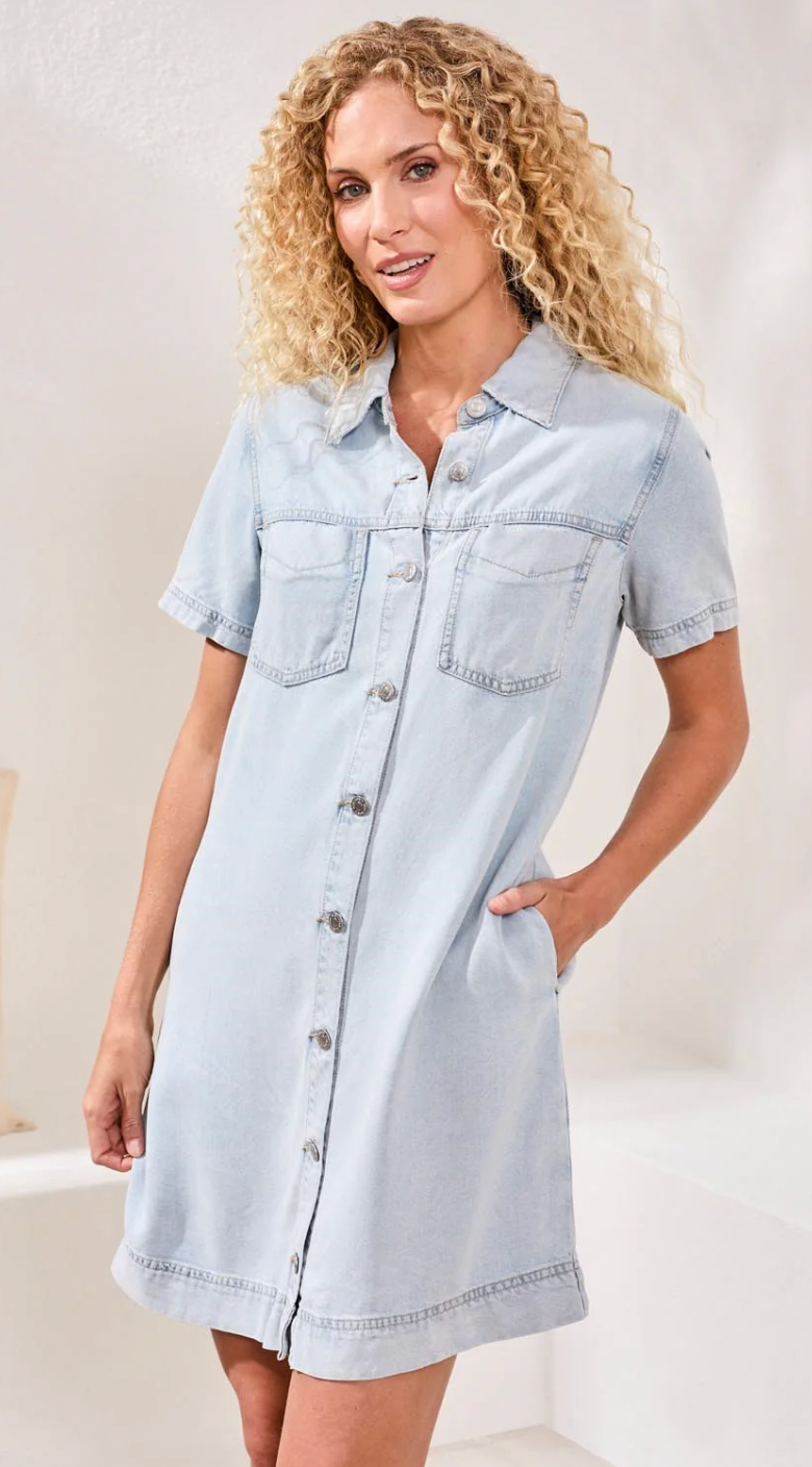 A polished, premium flowy denim shirt dress with modern patch pockets and a button front for easy styling. Designed in 100% lyocell, this piece blends structure and softness for a flattering, go-anywhere look—wear it solo...